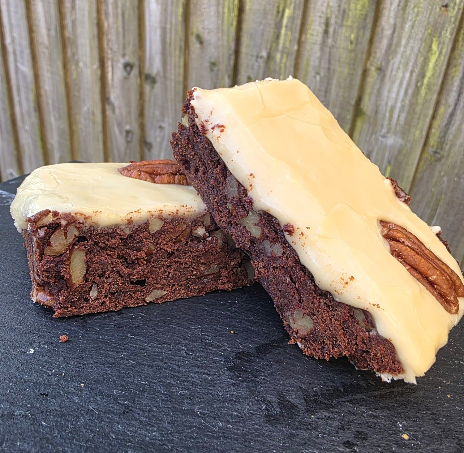 Indulge in our Brownie 'Nuts about Maple'—a playful twist on a classic treat! Dive into a rich, fudgy brownie studded with crunchy pecan pieces. Topped with icing sugar blended with maple syrup. Perfect for those who love a little nutty sweetness with their chocolate fix!